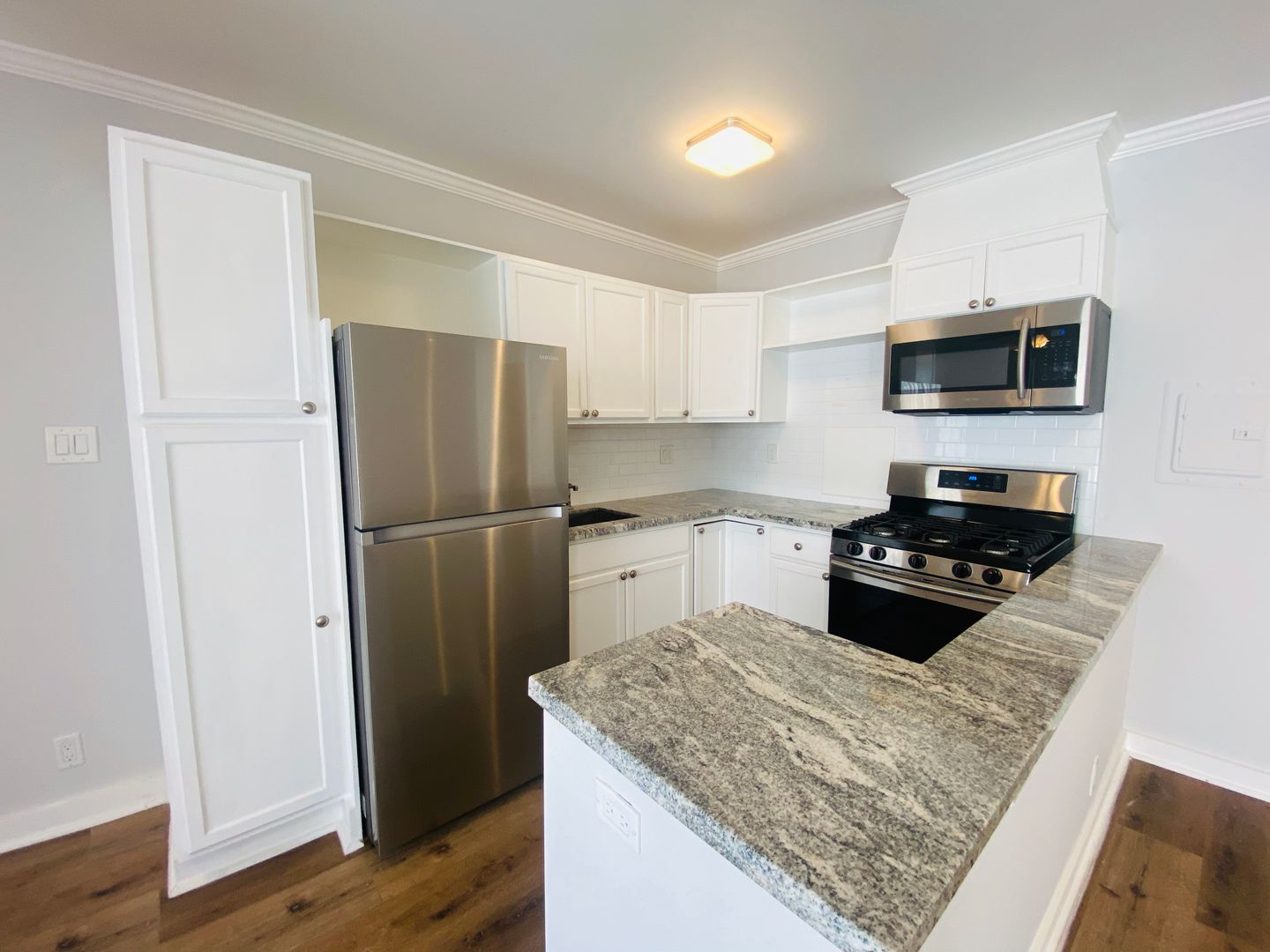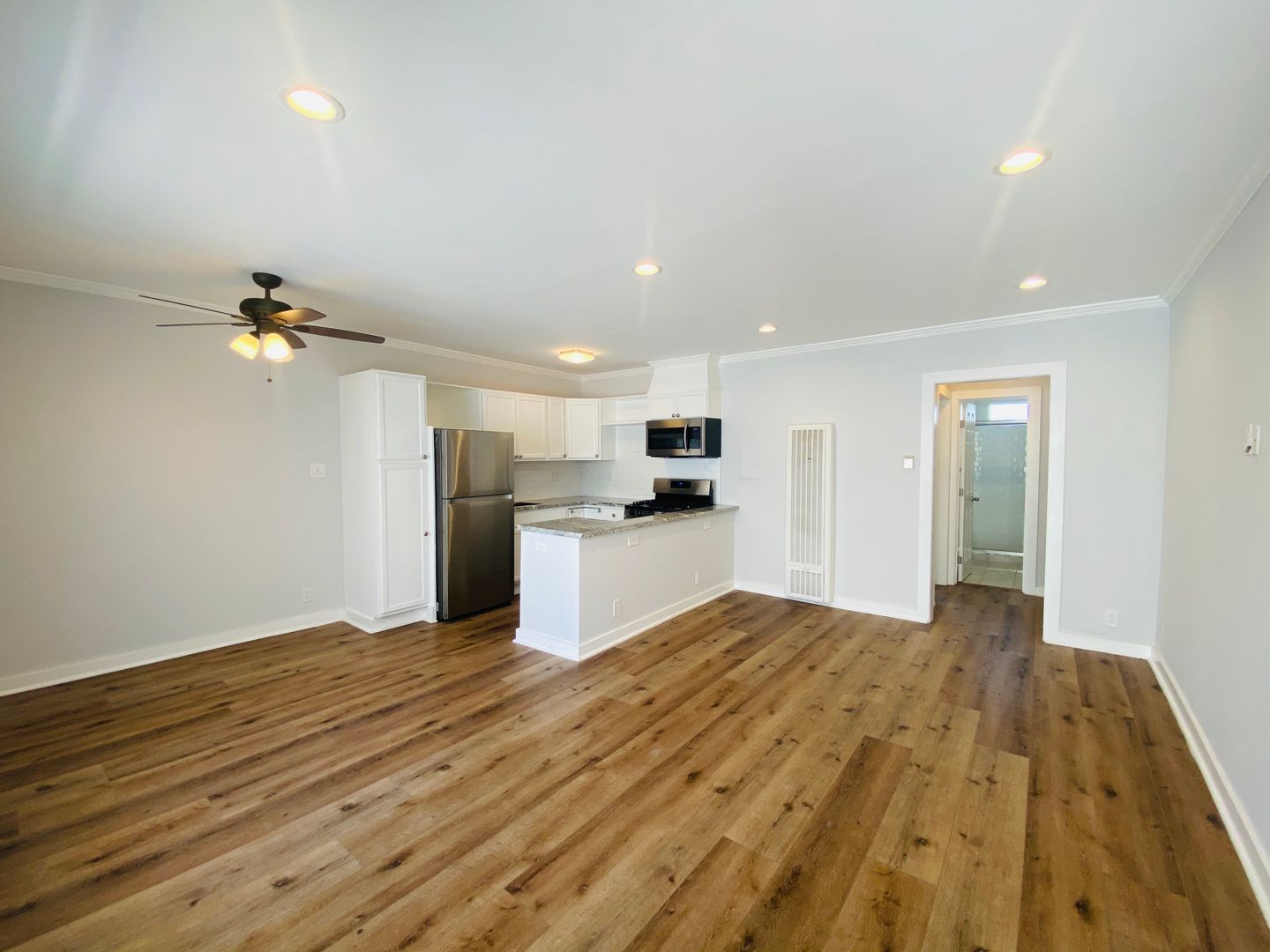 Beautiful hardwood flooring throughout. Large living room with an open floor plan, recessed lighting.